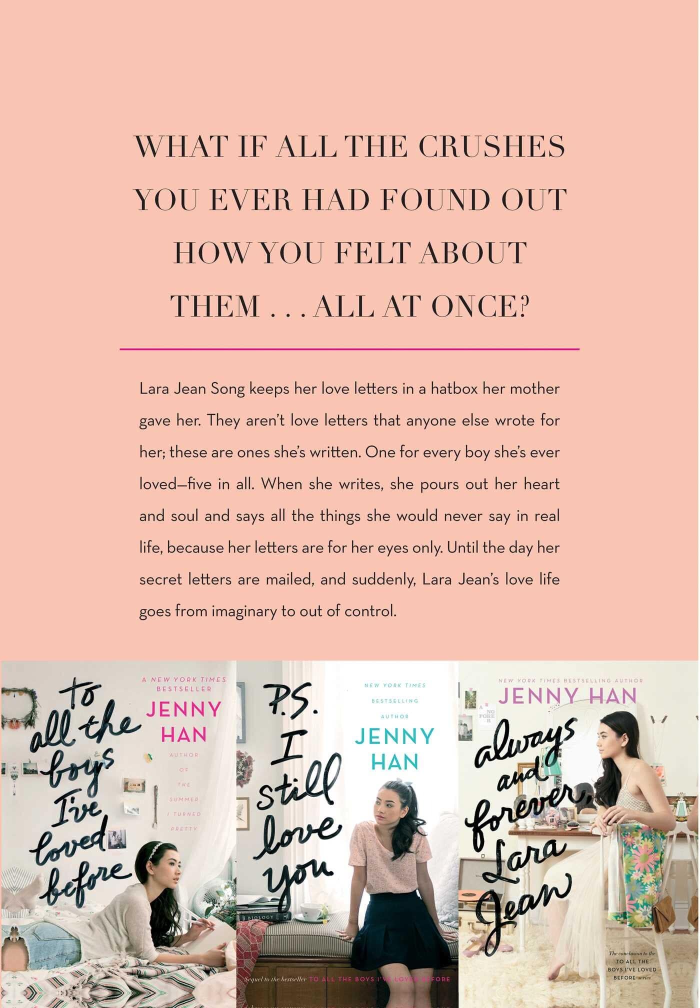 Lara Jean Song keeps her love letters in a hatbox her mother gave her. They aren’t love letters that anyone else wrote for her; these are ones she’s written. One for every boy she’s ever loved—five in all. When she writes, she pours out her heart and soul and says all the things she would never say in real life, because her letters are for her eyes only. Until the day her secret letters are mailed, and suddenly, Lara Jean’s love life goes from imaginary to out of control.